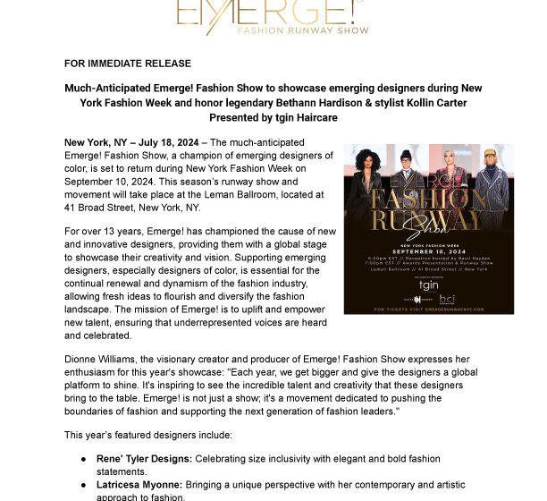 FOR IMMEDIATE RELEASE Much-Anticipated Emerge! Fashion Show to showcase emerging designers during New York Fashion…