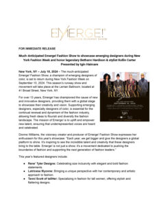 Emerge! NYFW press release 2024 FOR IMMEDIATE RELEASE Much-Anticipated Emerge! Fashion Show to showcase emerging designers during New York Fashion Week and honor legendary Bethann Hardison & stylist Kollin Carter Presented by tgin Haircare Click here for more information Previous Article Emerge! Fashion Runway Show 2024 Next Article EMERGE! September 10, 2024